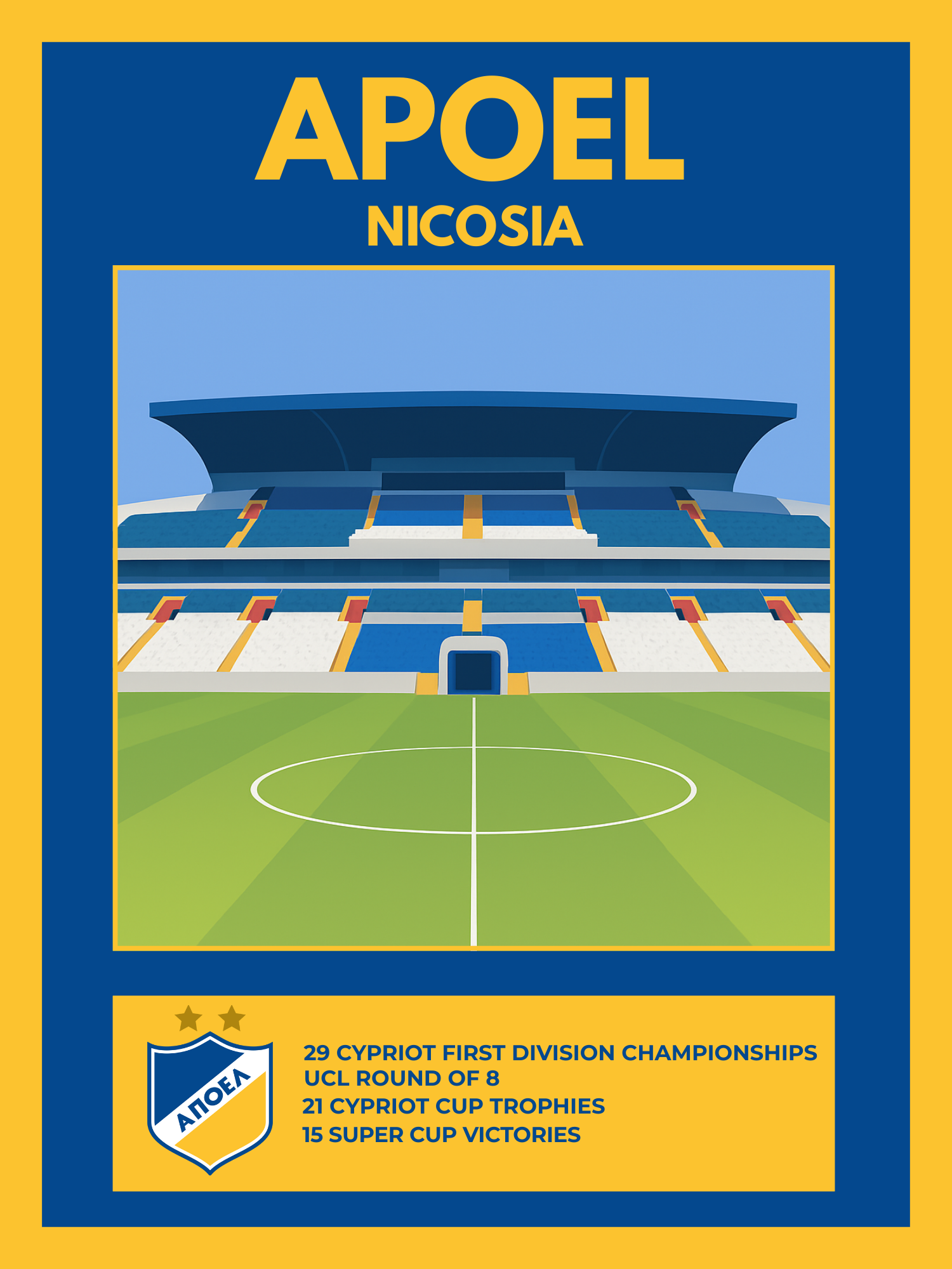 Premium vector illustration poster featuring APOEL FC away stadium design. Available in multiple sizes and formats.